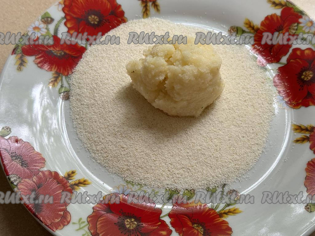На плоскую тарелку насыпать манку (или муку), в которой вы будет обваливать котлеты. Из каждой части картофельной массы сформировать круглую котлету, обваливая её со всех сторон в манке (или муке). Я вначале сформировала и обваляла в манке 5 котлет - именно столько у меня одновременно помещается в чаше аэрогриля.