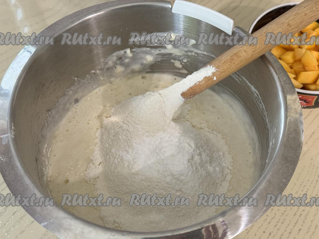 Всыпать 150 грамм просеянной муки и весь разрыхлитель, перемешать тесто лопаткой до однородности.