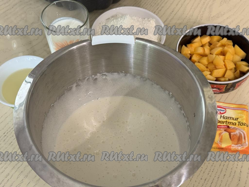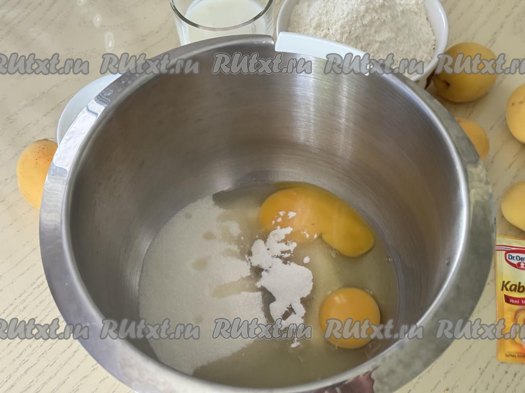 Взбить яйца с сахаром миксером на максимальной скорости в течение 4-5 минут. В процессе взбивания яичная масса посветлеет, увеличится в объёме, сахар растворится. Пока взбиваются яйца, вымыть абрикосы, немного обсушить, нарезать на средние кубики.