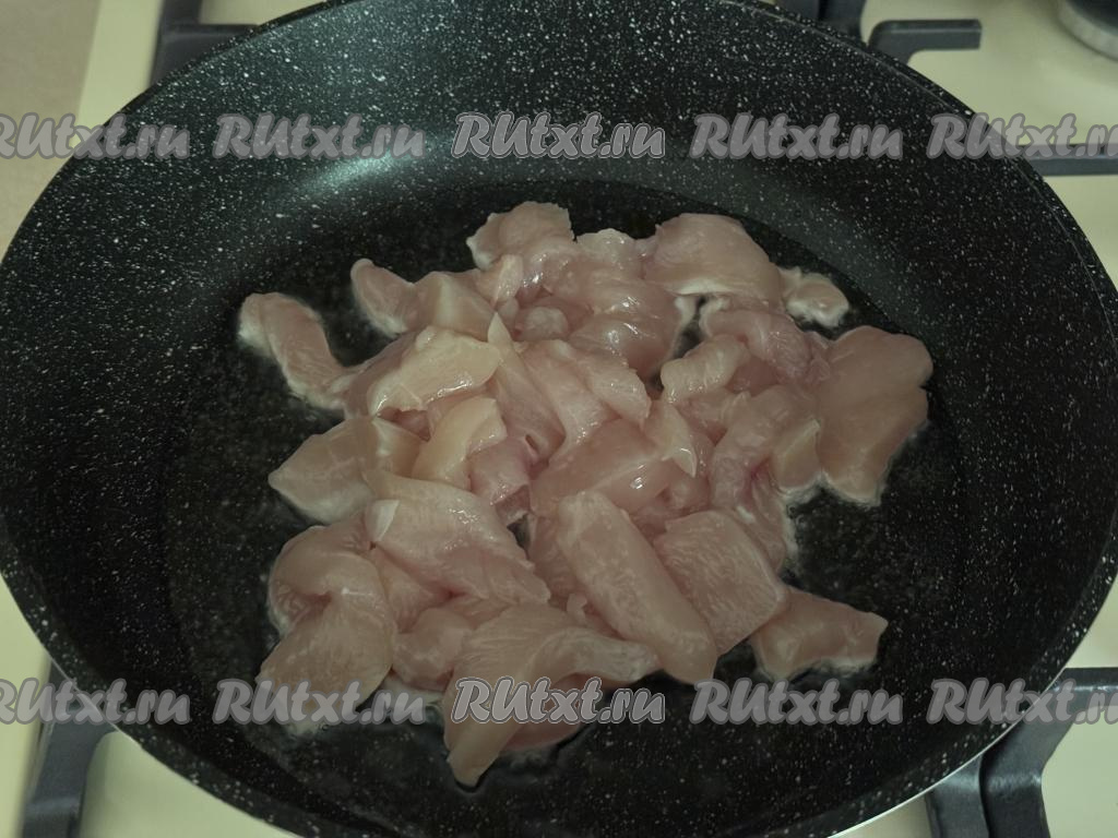 Куриное филе нарезать на брусочки, посолить, перемешать. В сковороду с высоким бортиком влить растительное масло, хорошо его разогреть, выложить кусочки мяса курицы.