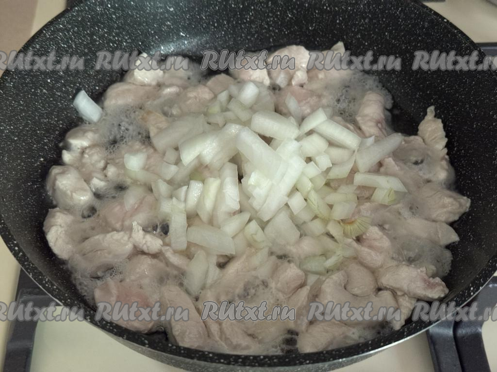 Обжарить мясо на достаточно сильном огне в течение 5 минут, периодически перемешивая. К обжаренному мясу курицы добавить мелко нарезанный лук, перемешать.