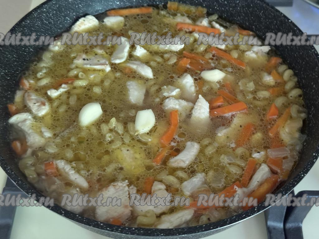 Перемешать макароны с курицей и овощами. Выложить очищенные зубчики чеснока. Дать воде закипеть, накрыть сковороду крышкой. Готовить плов из макарон с курицей на минимальном огне 15 минут.