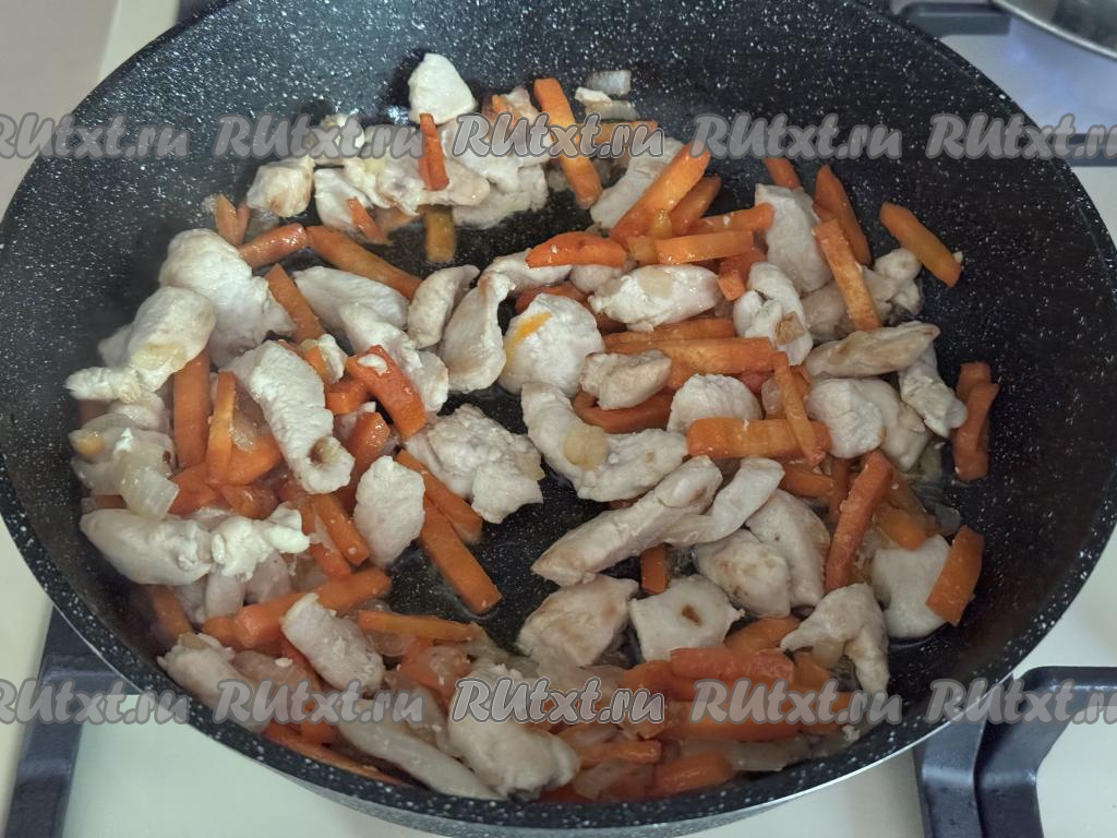 Обжарить курицу с луком в течение 4-5 минут на среднем огне, иногда перемешивая. Затем выложить морковь, нарезанную на небольшие брусочки, перемешать.