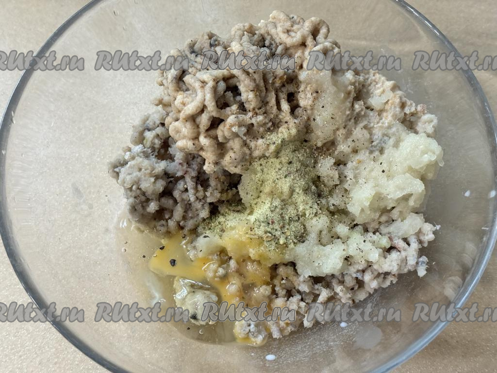 В миску с фаршем, хлебом и луком добавить соль и специи по вкусу, сырое яйцо.