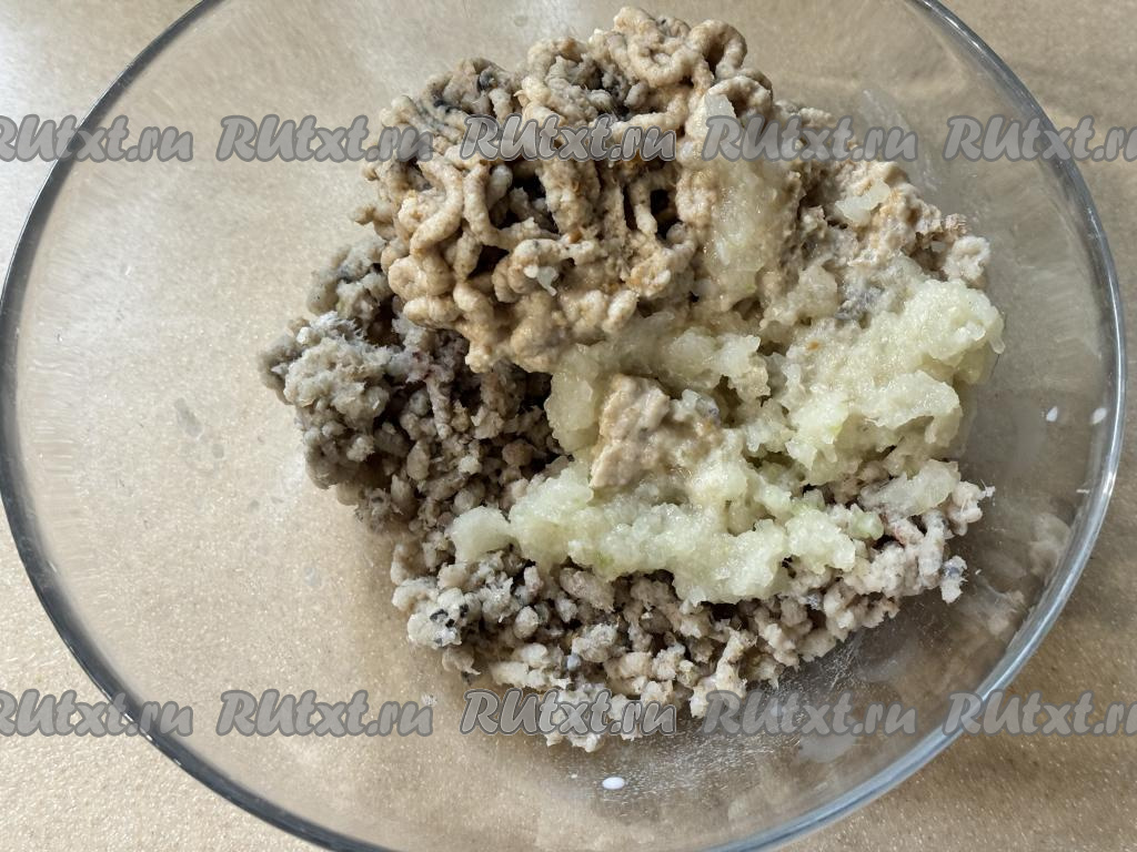Белый хлеб отжать руками от лишнего молока, в котором он замачивался. Лук почистить. В глубокую миску пропустить через мясорубку филе минтая, лук и хлеб.