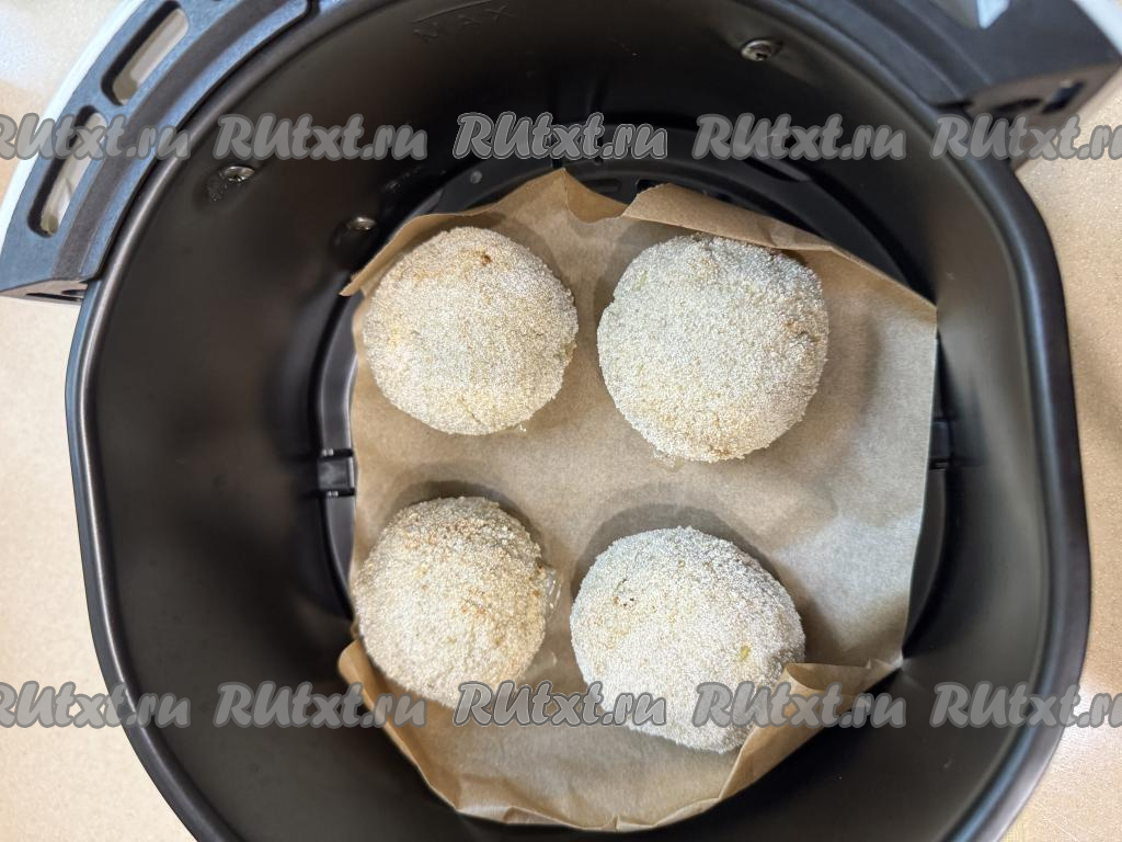 Чашу аэрогриля застелить пергаментом, выложить сформированные котлеты. У меня все котлеты не поместились в чашу, поэтому я жарила их в два этапа.