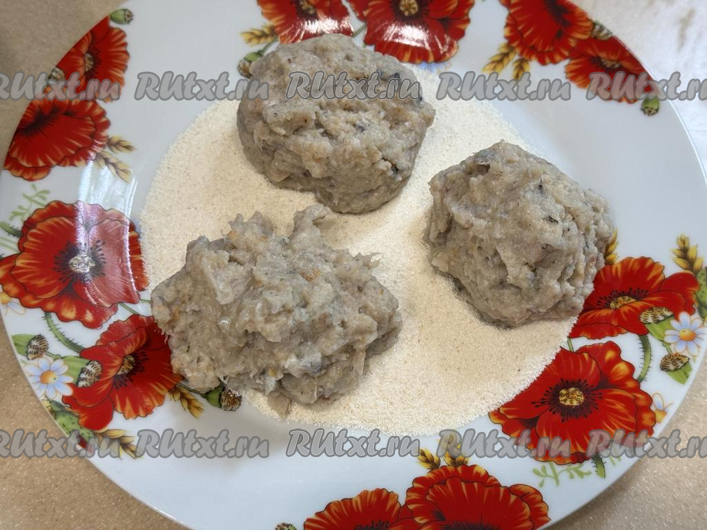 Хорошо вымесить фарш руками, затем разделить его на 6 частей. На достаточно плоскую тарелку насыпать манку (или муку). Из каждой части фарша сформировать рыбную котлету, обваливая её со всех сторон в манке (или муке).