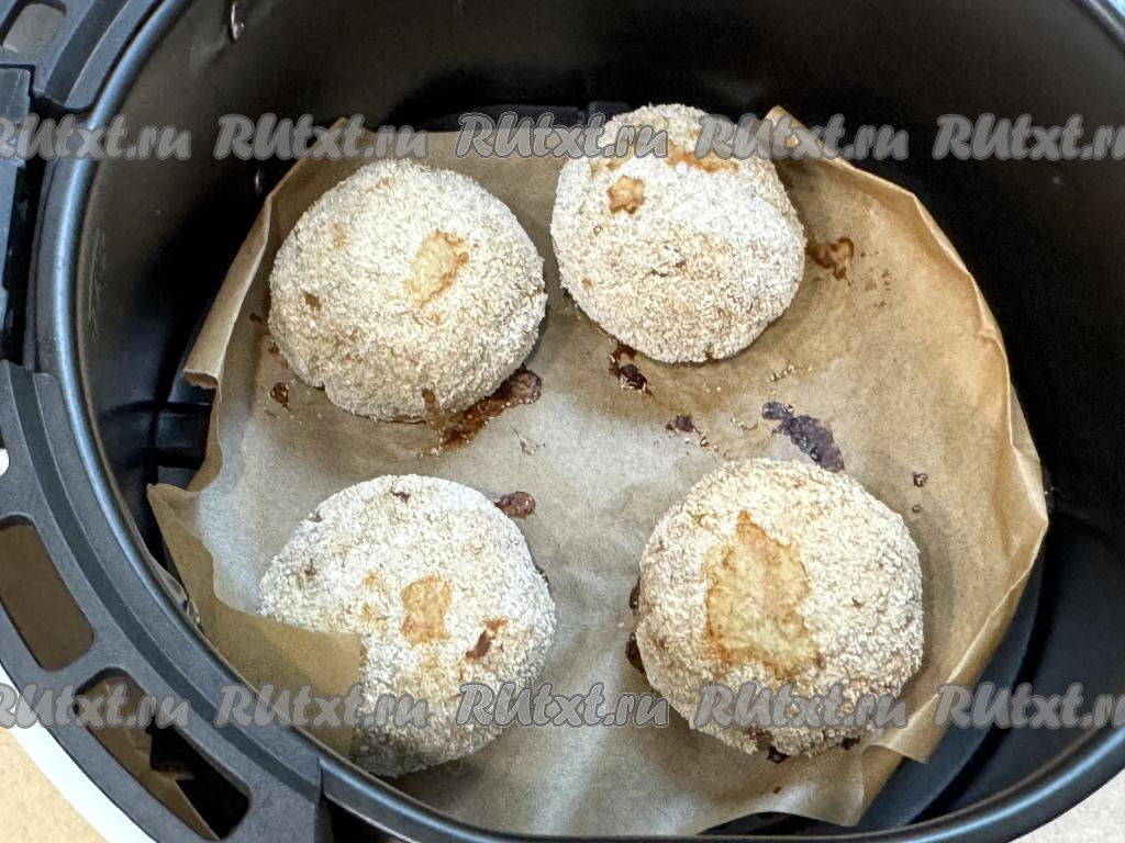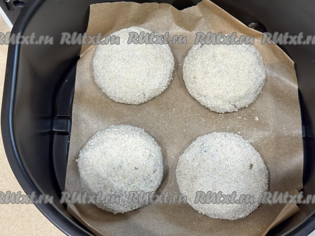 Чашу аэрогриля застелить пергаментом, выложить сформированные котлеты. У меня все котлеты не поместились в чашу, поэтому я жарила их в два этапа. Советую покрывать панировкой котлеты непосредственно перед запеканием. То есть если у вас помещаются в чашу аэрогриля 4 котлеты, то и обваливать в манке (или муке) непосредственно перед запеканием нужно 4 котлеты.