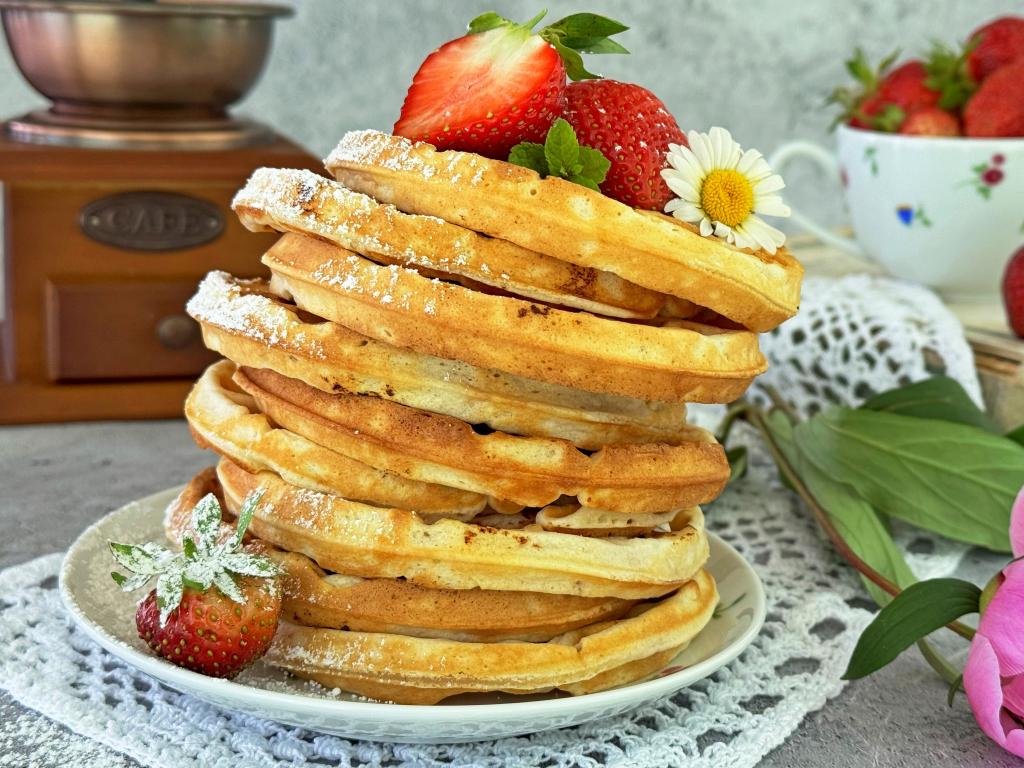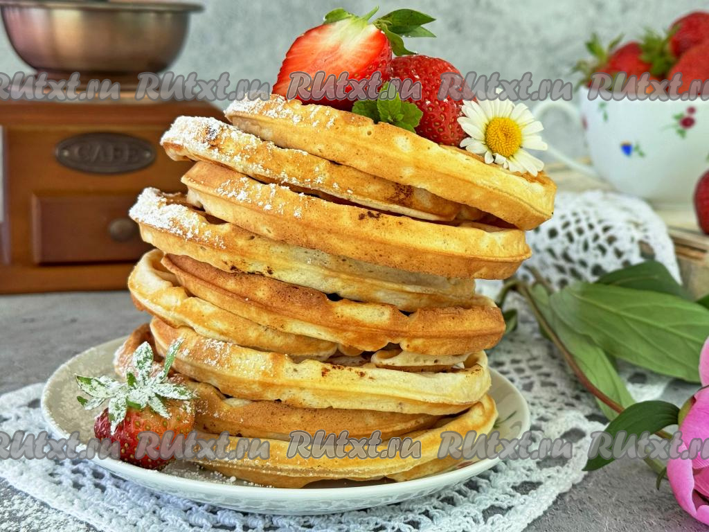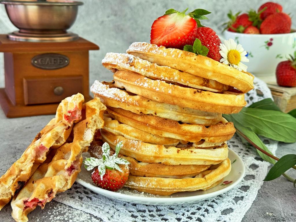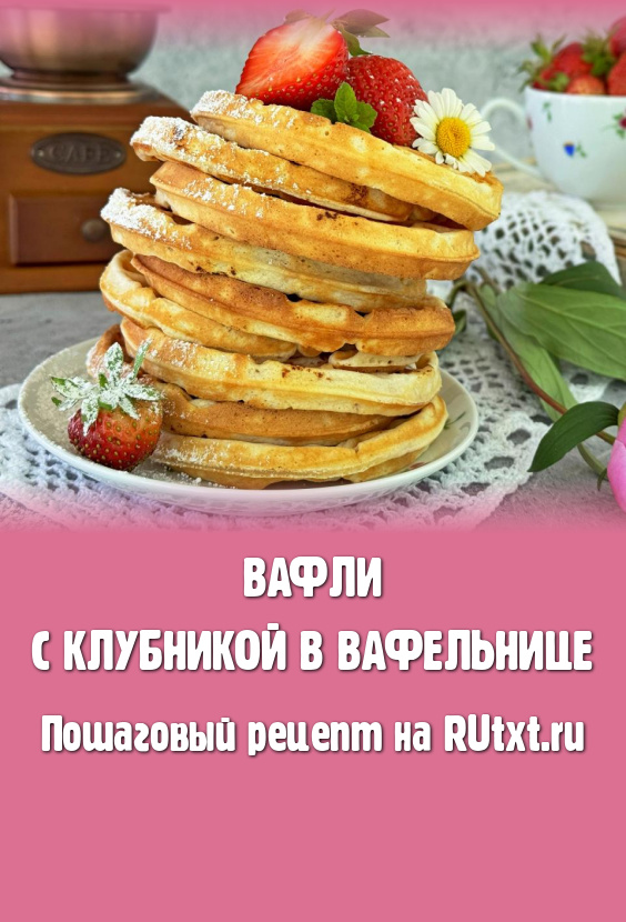 Мягкие, нежные вафли с клубникой подать к столу с чашечкой кофе или чая.