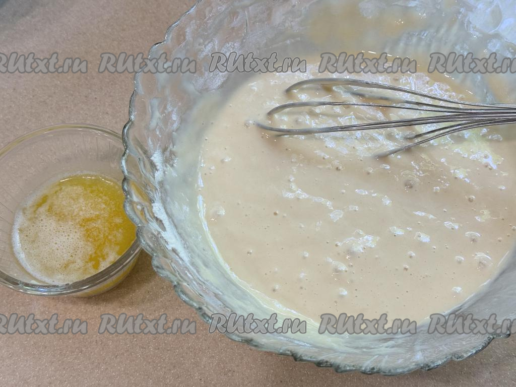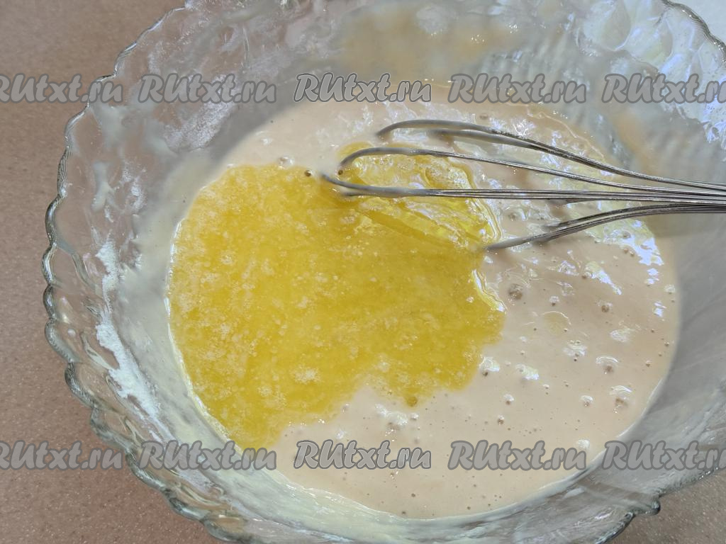 Влить растопленное остывшее масло в тесто, перемешать.