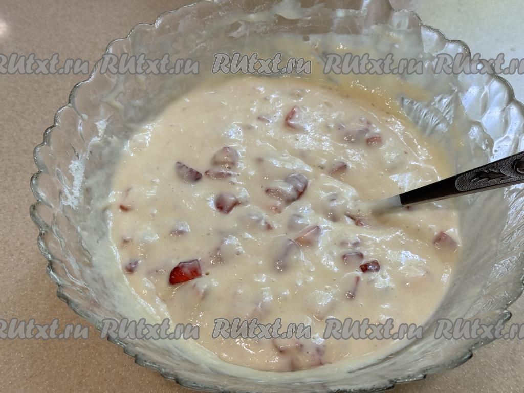 С помощью столовой ложки аккуратно вмешать клубнику, равномерно распределяя ягоды по всему тесту.