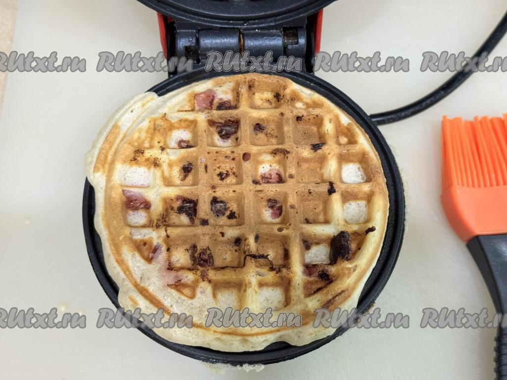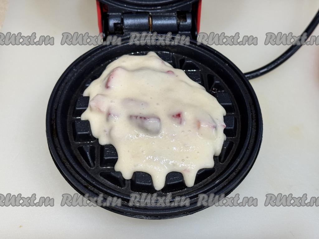 Закрыть створки вафельницы, выпекать вафлю с клубникой минуты 3-4. Продолжительность выпечки зависит от мощности вашей вафельницы, готовая вафля должна хорошо подрумяниться.