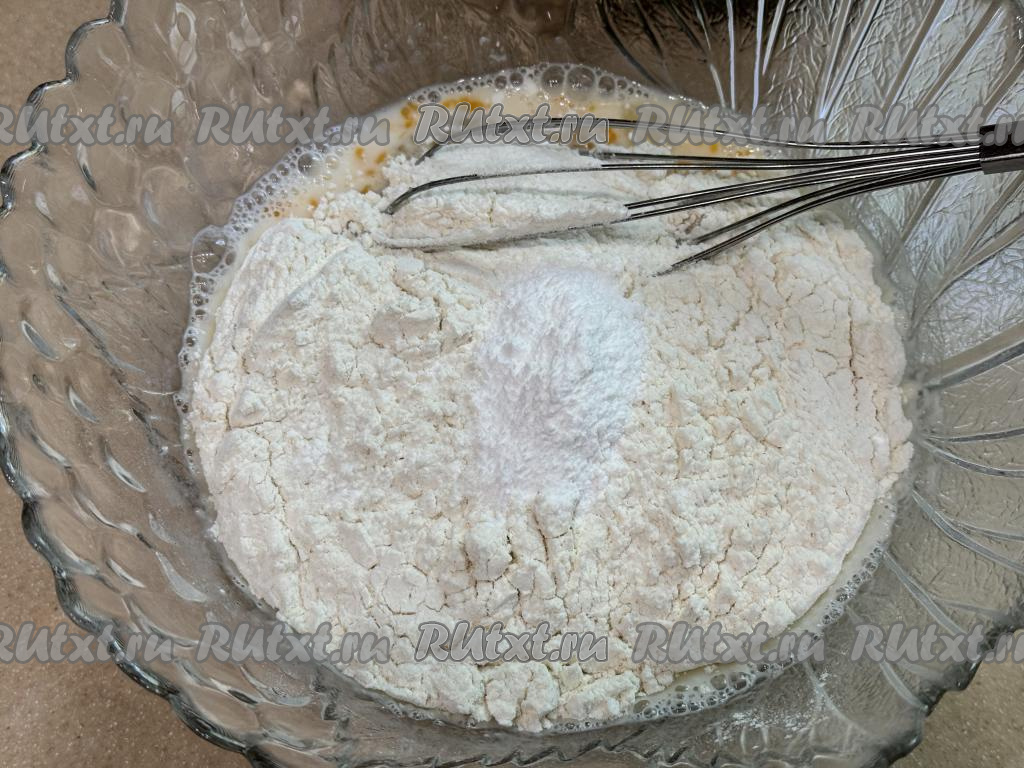 Всыпать сахар, разрыхлитель, соль и 100 грамм муки.