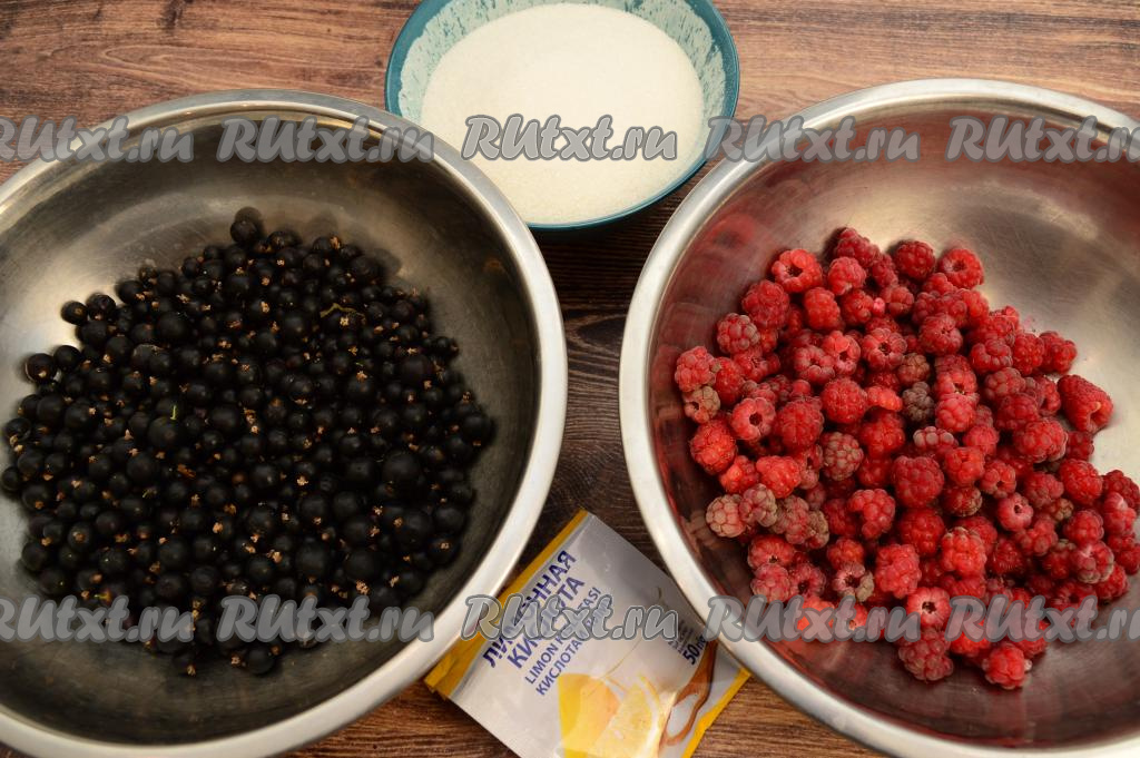 Малину перебрать, удаляя подпорченные ягодки, отмерить нужное количество ягод, выложить в дуршлаг, промыть проточной водой, дать стечь лишней воде, после этого переложить из дуршлага на тарелку. Чёрную смородину перебрать, удаляя веточки, листочки и подпорченные ягоды. Выложить смородину в дуршлаг, хорошо промыть проточной водой, лишней воде дать стечь, переложить в миску.