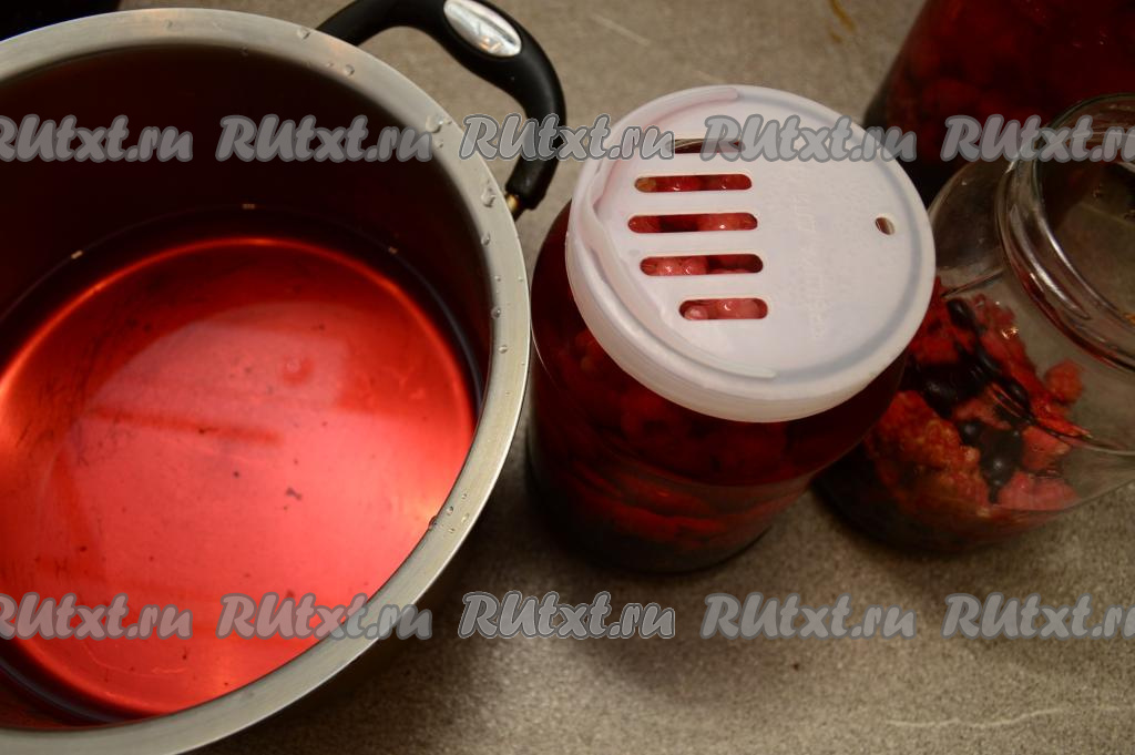 Вскипятить в чайнике (или в кастрюле) воду. Залить банки с ягодами до самого верха кипящей водой. Прикрыть прокипячёнными крышками и оставить на 20 минут постоять при комнатной температуре.
