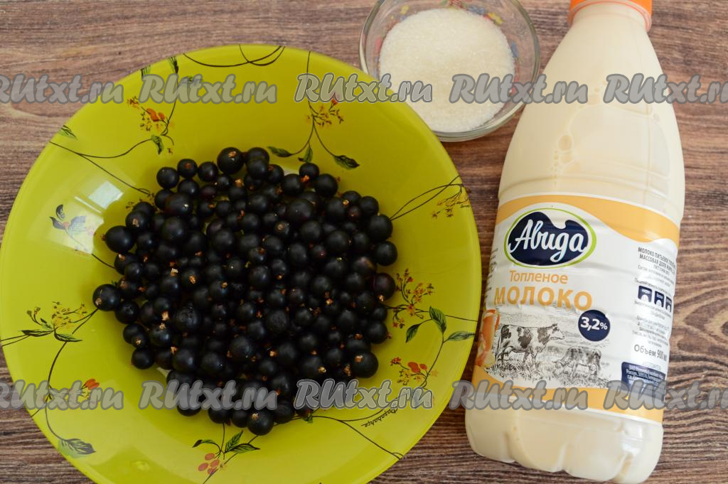 Подготовить продукты. Молоко можно взять любой жирности (я купила жирностью 3,2%). Чёрную смородину можно взять как свежую, так и замороженную. Свежие ягоды нужно перебрать, удаляя веточки, листья, подпорченные ягодки, затем промыть водой, лишнюю воду слить. Если будете использовать замороженную смородину, тогда её нужно будет немного разморозить при комнатной температуре.