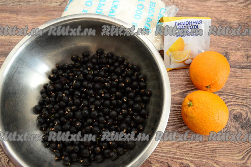 Подготовить продукты. Апельсины тщательно вымыть, обдать кипятком. Чёрную смородину перебрать, убирая все веточки, листочки, подпорченные ягоды. Выложить смородину в дуршлаг, тщательно промыть проточной водой. Оставить ягоды в дуршлаге на несколько минут, чтобы стекла вода.