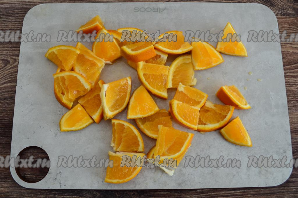 Апельсин нарезать на кружочки, затем каждый кружочек разрезать на четыре части, обязательно удаляя все косточки.