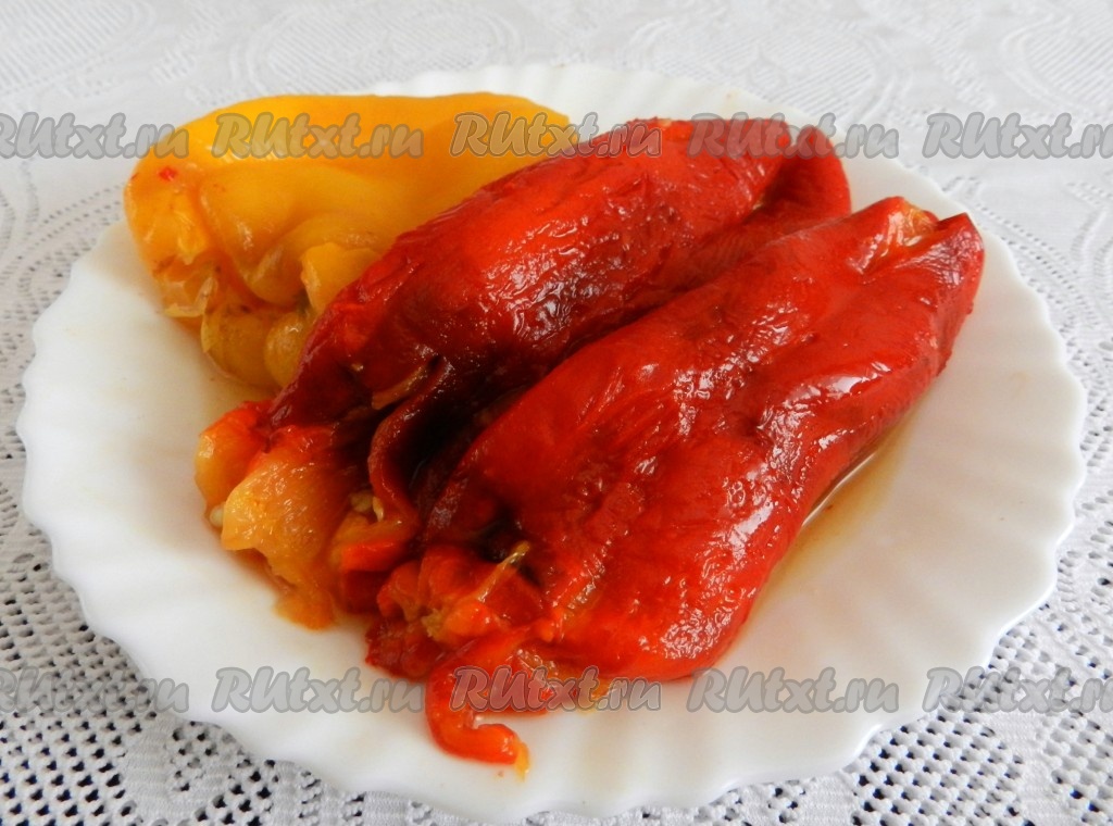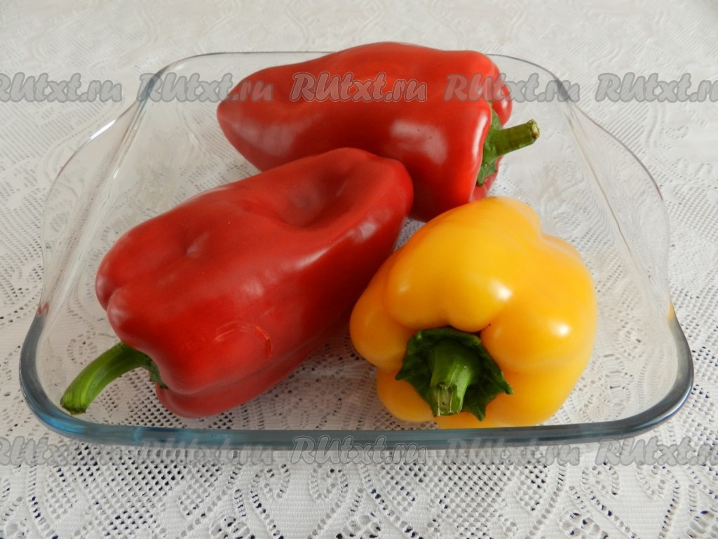 Крупные перцы вымыть, обсушить. Выложить в форму или противень, застеленный бумагой, и запечь перцы в духовке 20 минут при температуре 200 градусов.