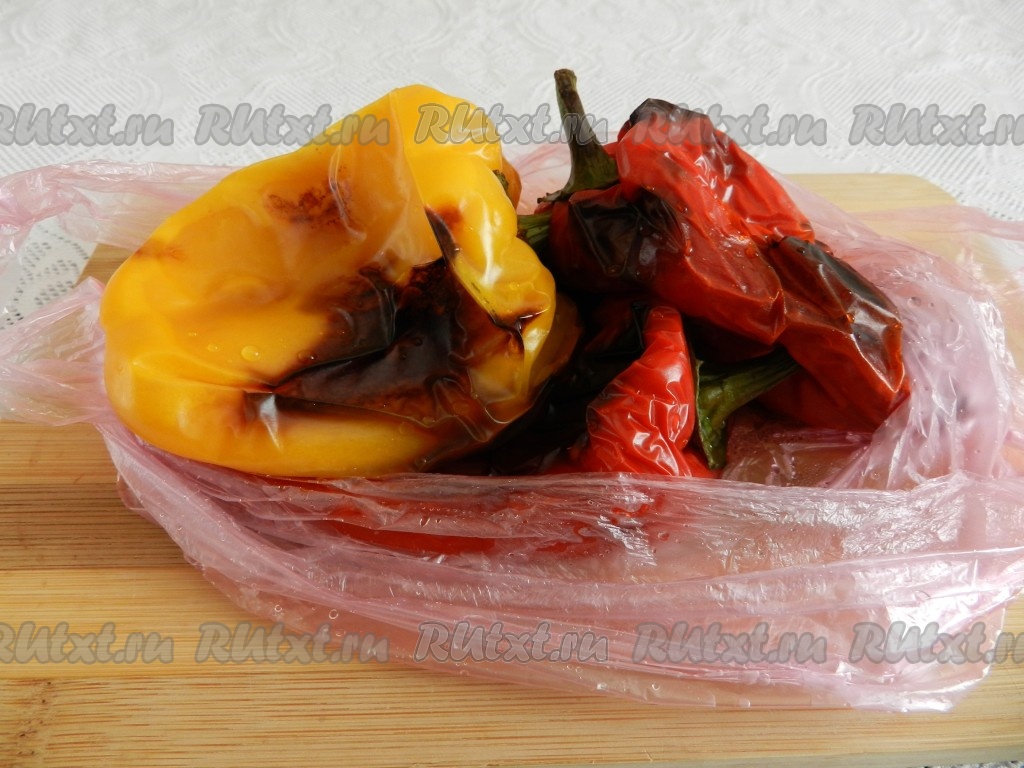Пакет плотно завязать и оставить запеченные перцы в пакете на 15-20 минут.