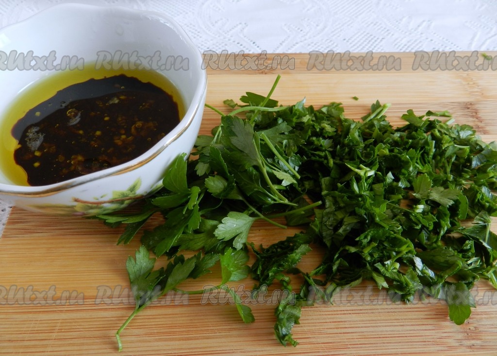 Петрушку мелко нарубить. Чеснок пропустить через пресс, смешать с солью, перцем, оливковым маслом и бальзамическим уксусом.