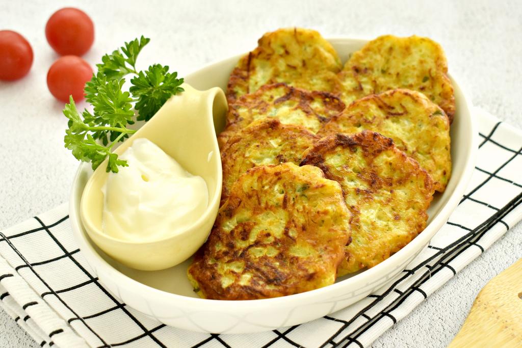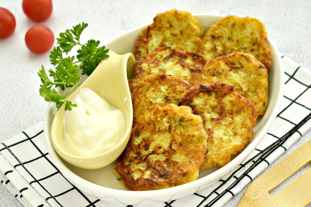 Нежные, вкусные, аппетитные оладьи, приготовленные из кабачков, подаём к столу со сметаной или соусом на ваш выбор.