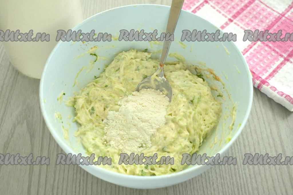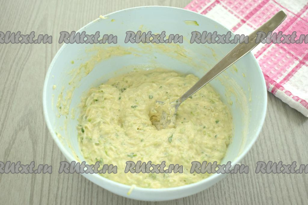 Добавляя муку, учитываем, что кабачковое тесто должно выйти в меру вязким и густым. Для получения теста нужной густоты я добавила 4,5 столовых ложки муки. Но количество муки, которое придётся вам добавить, зависит от величины яйца, жирности сметаны и безусловно от того, насколько хорошо вы отжали кабачки от лишней жидкости.