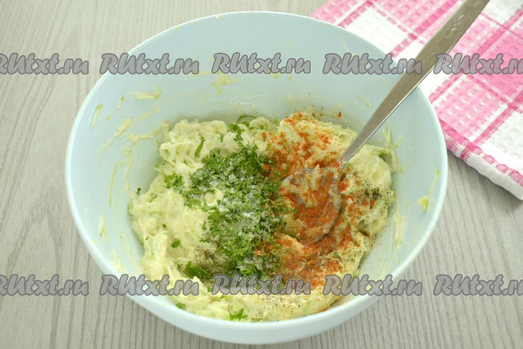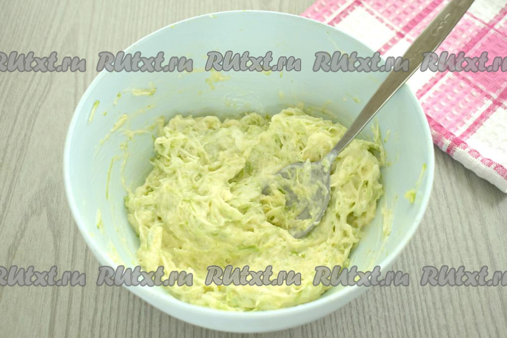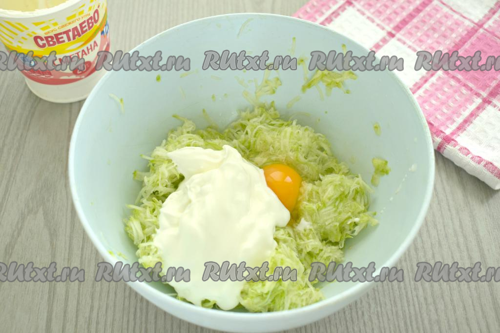 Сразу перемешиваем кабачковую массу со сметаной и яйцом.