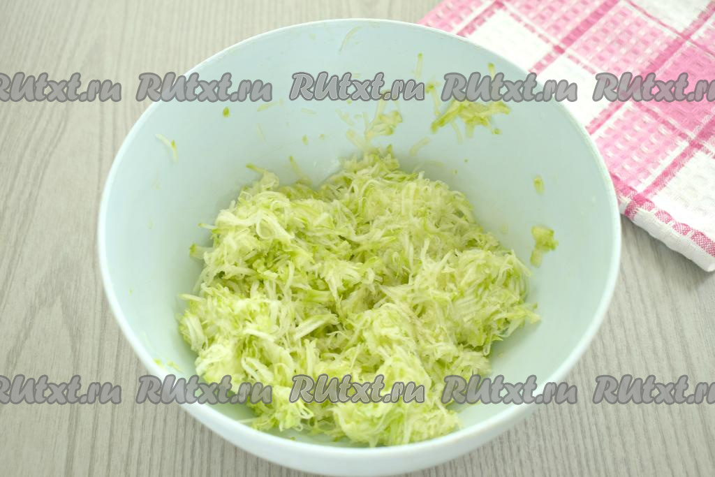 Кабачок моем. Если у кабачка толстая кожура, её нужно срезать. Если семечки у кабачка крупные, их тоже нужно будет удалить. Если же вы взяли кабачок с тонкой кожицей и мелкими семечками, тогда можно просто вымыть кабачок, обрезать кончики с двух сторон. В миску натираем 250 грамм подготовленного кабачка. Затем тщательно отжимаем натёртый кабачок от лишнего сока. Для этого можно брать частями в руки натёртый кабачок и тщательно отжимать кабачковую массу от лишней жидкости (эта жидкость нам больше не понадобится). Выкладываем кабачковую массу, отжатую от лишней жидкости, в объёмную миску.