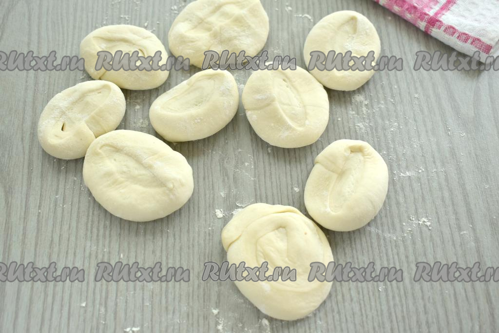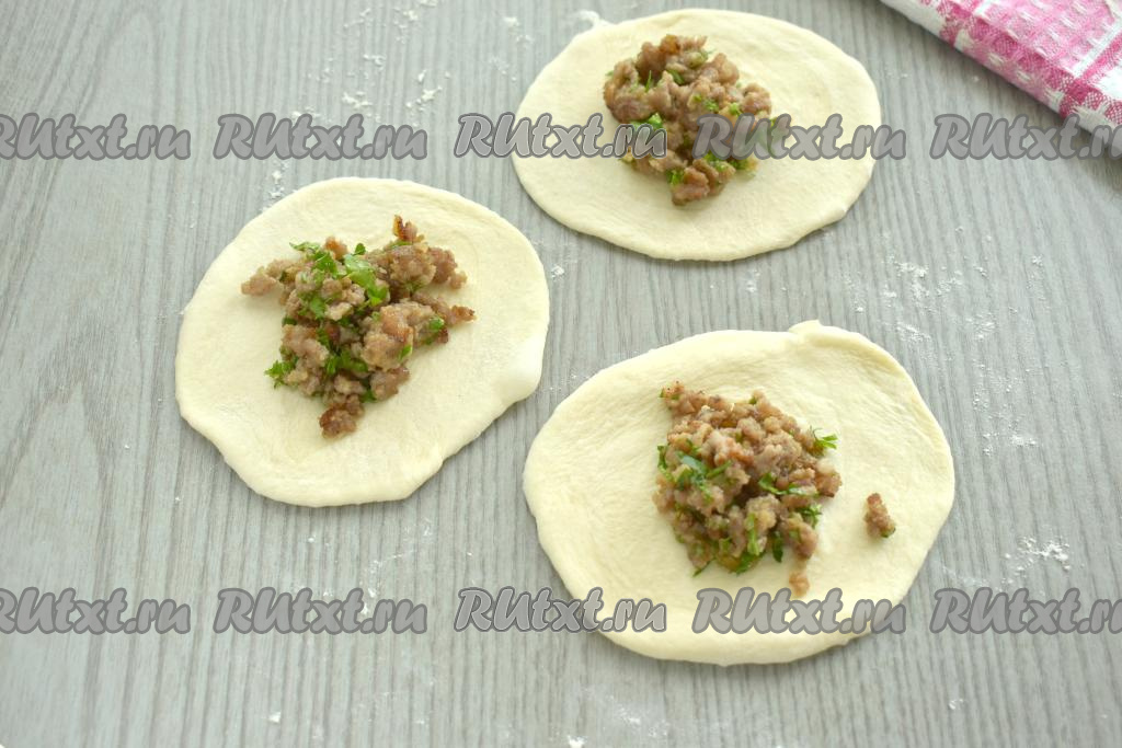 Заготовки из теста раскатываем в лепёшки диаметром ориентировочно 8-9 сантиметров. В центр каждой лепёшки выкладываем 1 столовую ложку остывшего фарша.
