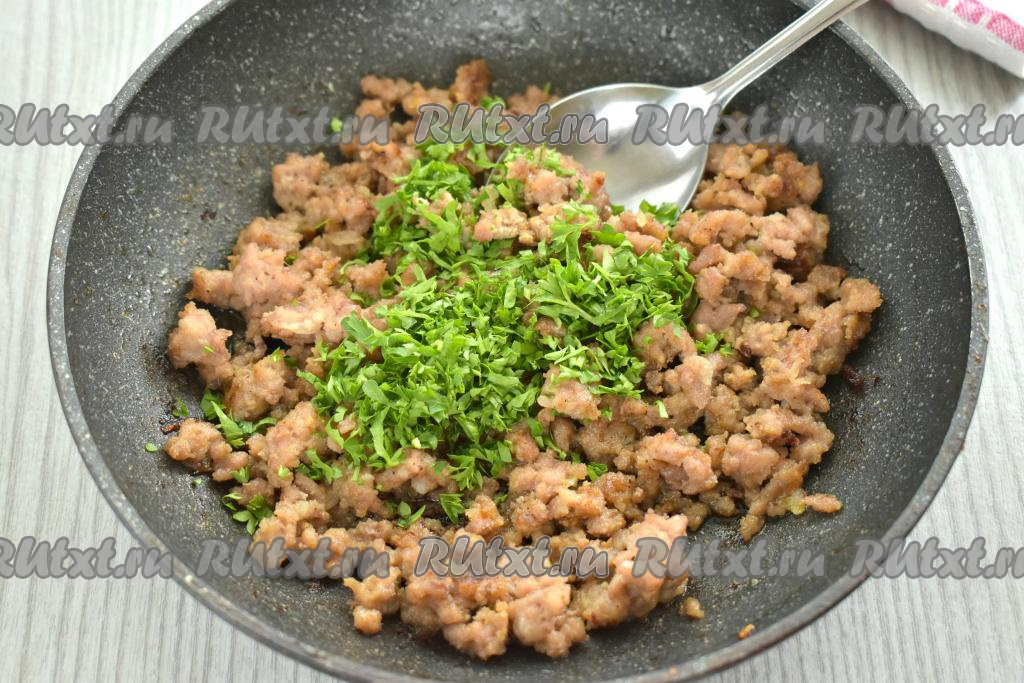 Для этого блюда можно использовать как покупной фарш, так и фарш, приготовленный в домашних условиях. Подойдёт фарш из любого мяса (например, из курицы, говядины, индейки). Я взяла кусочки свинины и пропустила их через мясорубку. К луку, обжаренному до мягкости, добавляем мясной фарш, по вкусу его солим, приправляем специями (я сдобрила фарш чёрным молотым перцем и паприкой). Обжариваем фарш с луком 10-12 минут, часто перемешивая и разбивая комочки мяса. Обжаренный фарш убираем с огня, даём остыть.