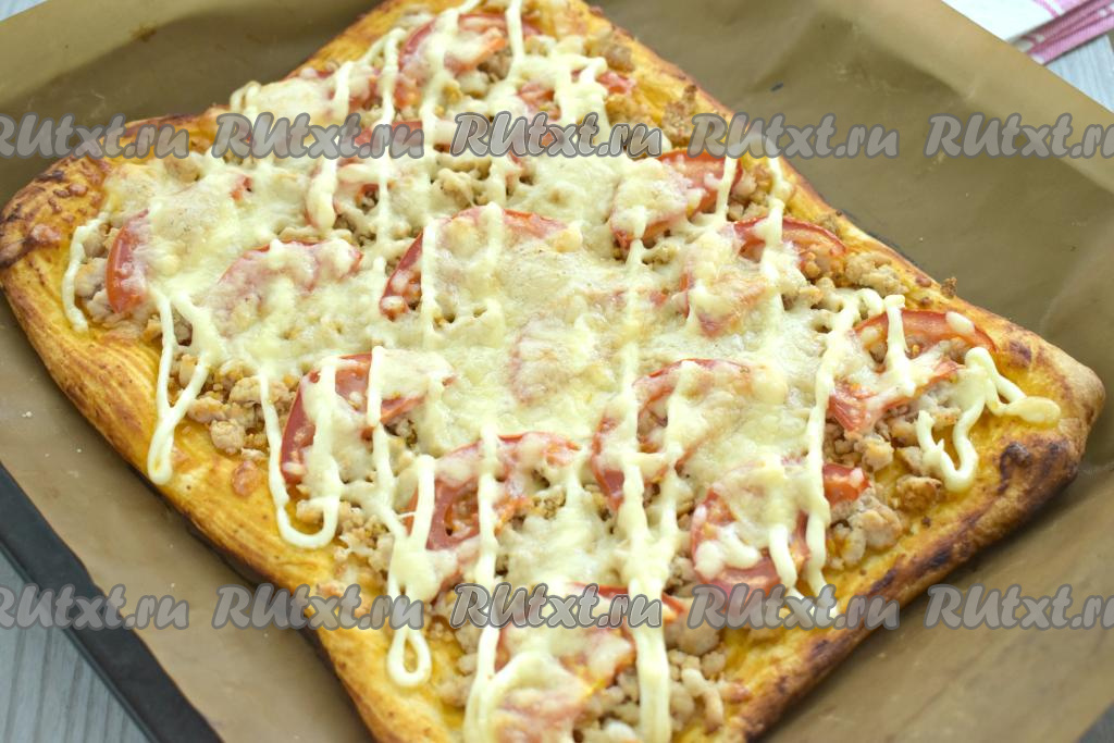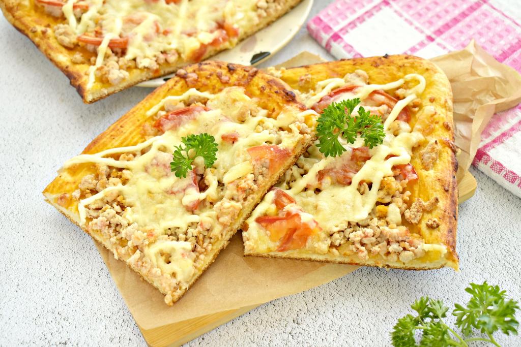 Готовую пиццу с фаршем достаём из духовки, нарезаем на кусочки и сразу, пока она не остыла, подаём её к столу. Сочетание воздушного теста и сочной, сытной начинки делает эту выпечку очень вкусной!