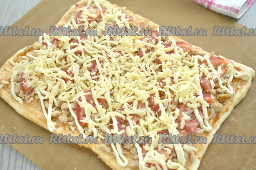 Равномерно присыпаем пиццу сыром, натёртым на крупной тёрке.