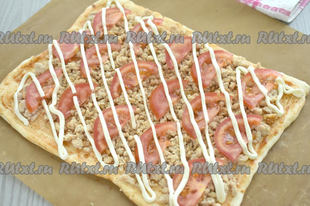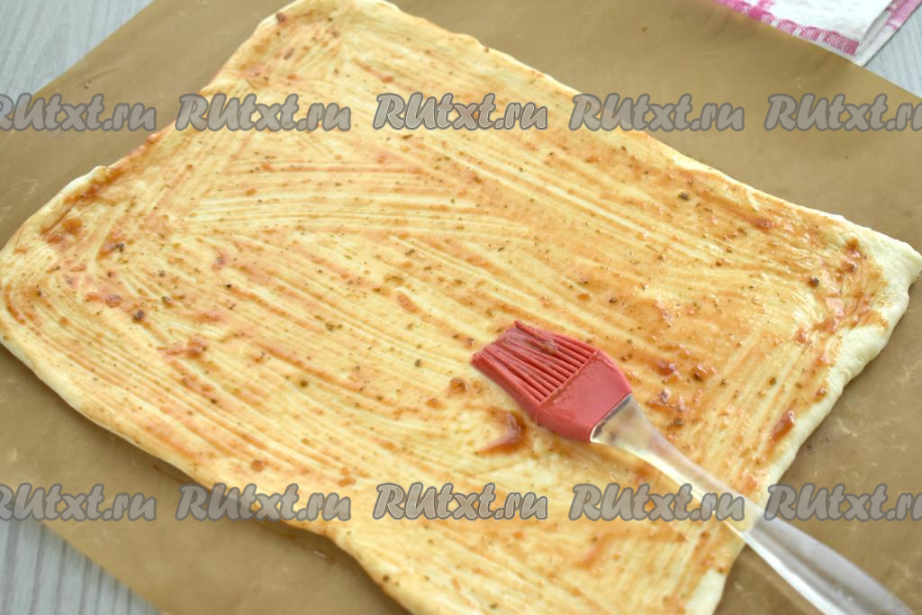 Пицца, как правило, бывает круглой формы, но я решила сделать её прямоугольной, так как слоёное тесто продаётся в прямоугольных пластах. На посыпанный мукой стол выкладываем пласт теста, раскатываем его до толщины примерно 3 миллиметра. У меня получился прямоугольник из теста размером 29 сантиметров на 20 сантиметров. Раскатанное тесто помещаем сразу на противень, застеленный бумагой (или ковриком) для выпечки. Смазываем раскатанное тесто томатным соусом (или кетчупом).