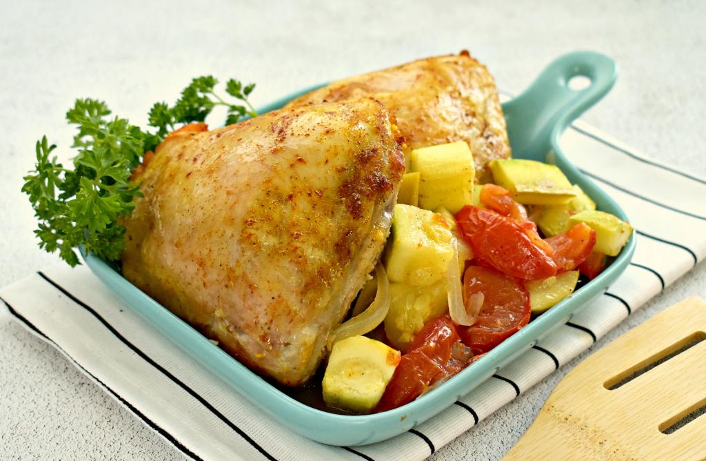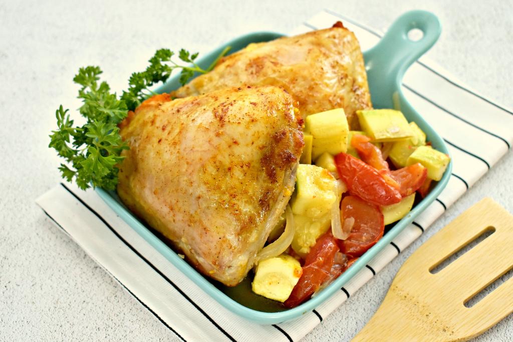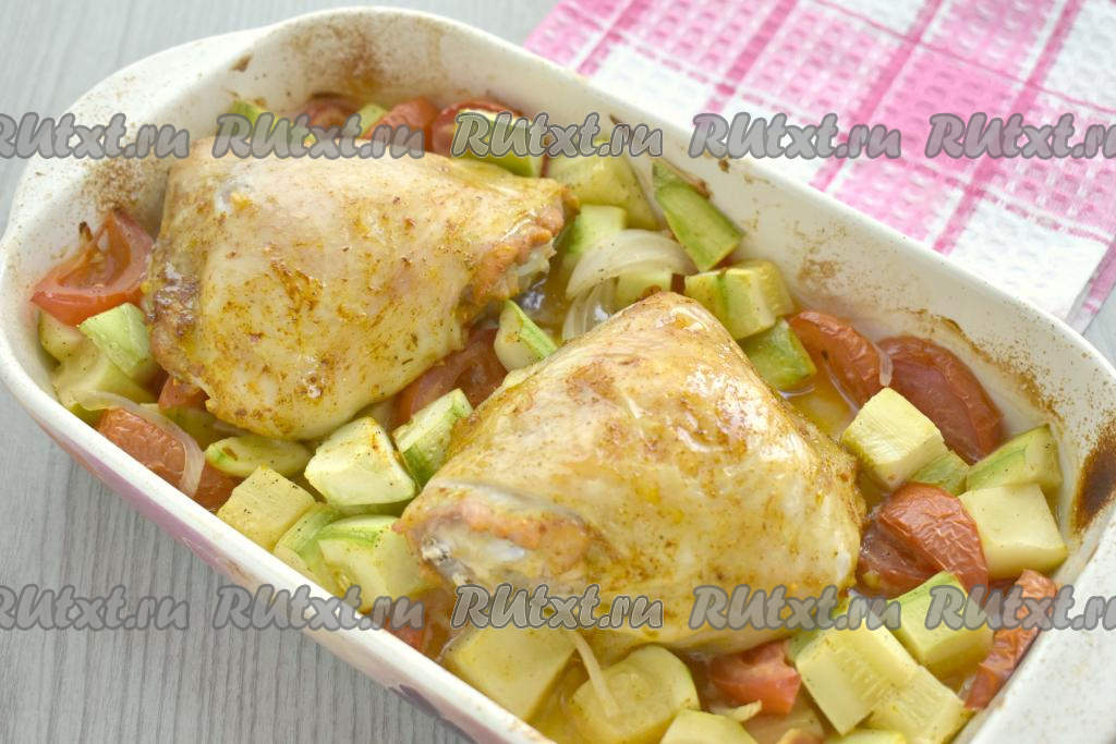 Достаём готовое блюдо из духовки. Аппетитные куриные бёдра вместе с сочными кабачками, помидорами и луком раскладываем по тарелкам и сразу подаём к столу.