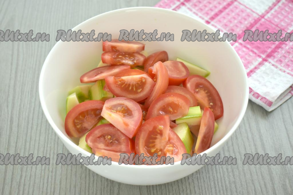 Вымытые помидоры, по желанию, очищаем от кожуры, затем нарезаем на дольки, добавляем к нарезанным кабачкам.