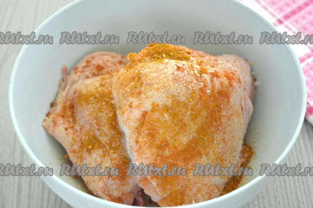 Куриные бёдра моем, срезаем лишний жир. Обсушиваем бёдрышки, затем натираем их со всех сторон солью и любимыми специями (в качестве специй я использовала 1 чайную ложку приправы для курицы).