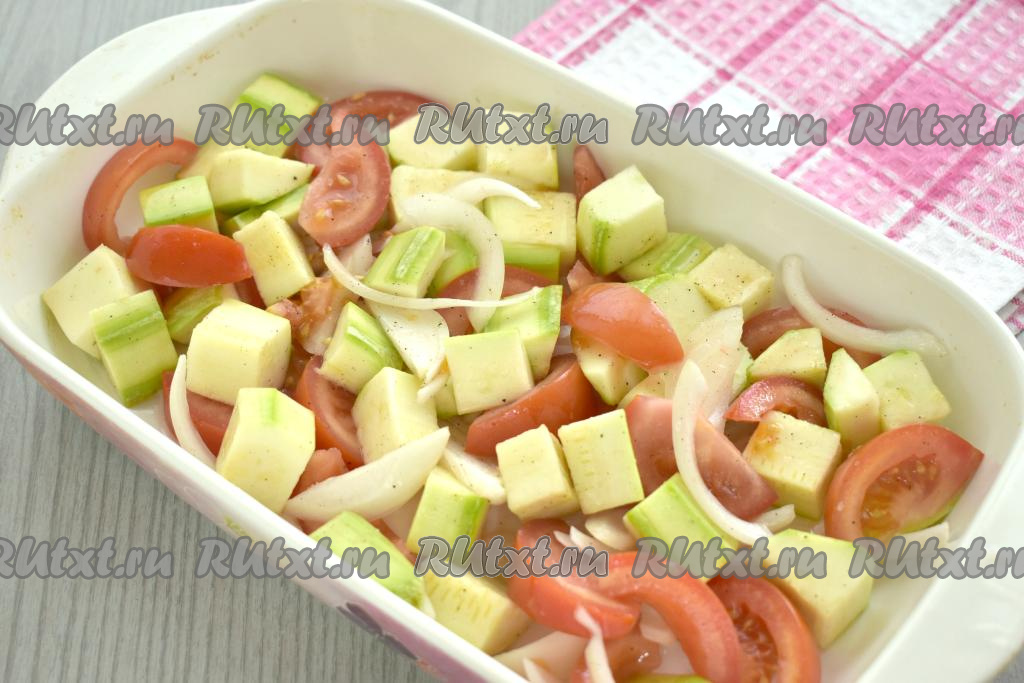 Форму для запекания смазываем растительным маслом. Ровным слоем в подготовленную форму выкладываем нарезанные овощи.