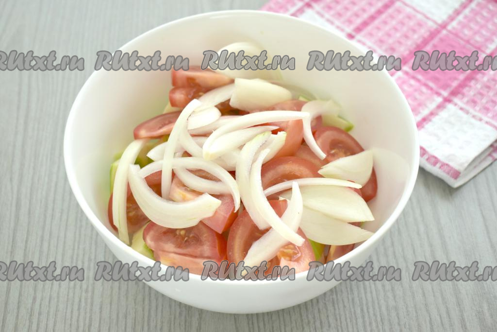 Очищаем репчатый лук, нарезаем перьями, добавляем к кабачками и помидорам.