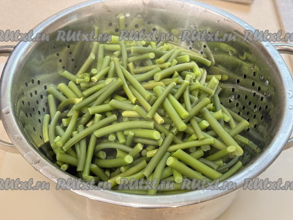 Отваренные чесночные стрелки откинуть на дуршлаг, лишней воде дать стечь.