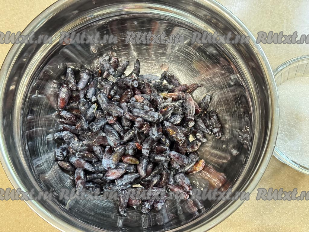 Подготовить продукты. Этот десерт можно приготовить из свежей или замороженной жимолости. Свежую жимолость нужно перебрать, удаляя листочки, затем выложить в сито, хорошо промыть водой, лишней воде дать стечь. Замороженную жимолость нужно разморозить, жидкость, выделившуюся при разморозке, - слить.