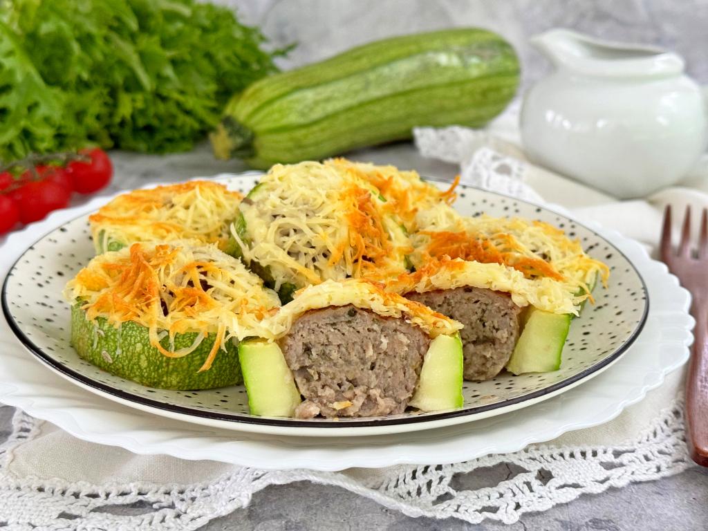 Выставить температуру в аэрогриле 160 градусов. Запекать кабачки, фаршированные фаршем, в течение 10 минут (до готовности кабачков, они должны легко прокалываться зубочисткой, сыр должен полностью расплавиться).