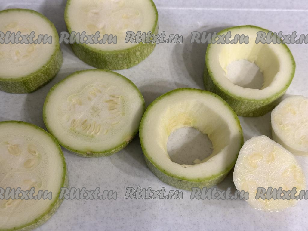 Кабачок нарезать на кружочки толщиной 2 сантиметра. У меня получились 6 кружочков. Вырезать серединку кабачка, чтобы остался бортик с мякотью. Вырезанную серединку я не использовала.