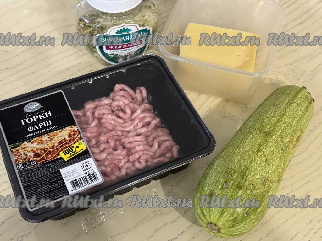 Подготовить продукты. Мясной фарш можно использовать любой. Я взяла покупной фарш из свинины и говядины, можно приготовить фарш и в домашних условиях, пропустив кусочки мяса через мясорубку. Я использовала молодой кабачок с тонкой кожурой, поэтому очищать от кожуры его не стала, просто хорошо вымыла его водой. Если вы возьмёте кабачок с толстой кожурой, её нужно будет срезать.