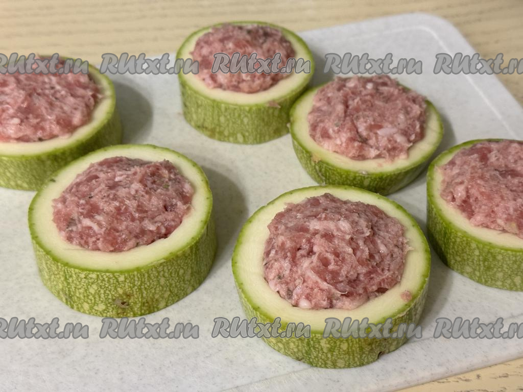 Разделить фарш на 6 равных частей и наполнить середину каждого кабачка фаршем.