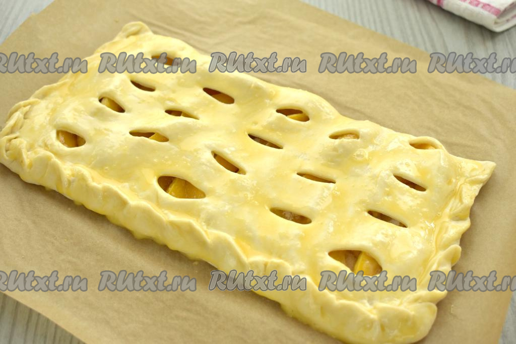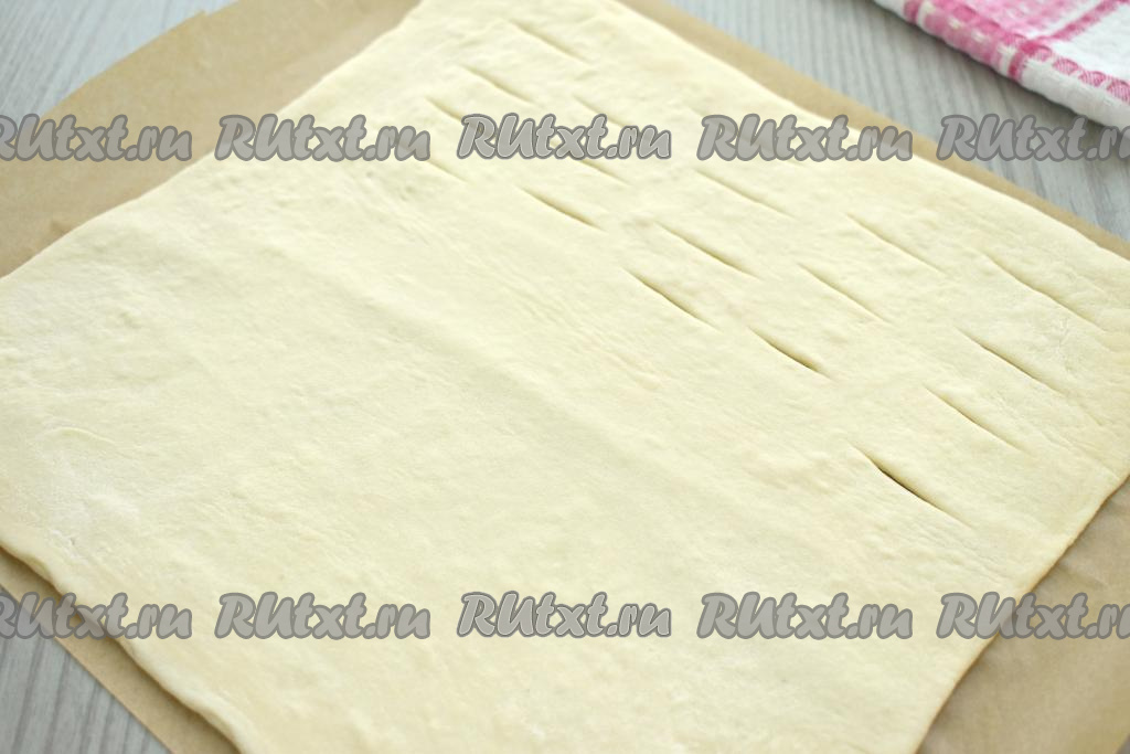 На слегка присыпанной мукой поверхности раскатываем размороженное слоёное тесто в квадратный пласт со стороной 29 сантиметров. Зрительно делим квадрат из теста на 2 половины. На одной половине теста, отступая от краёв 1,5-2 сантиметра, делаем небольшие надрезы (см. на фото).