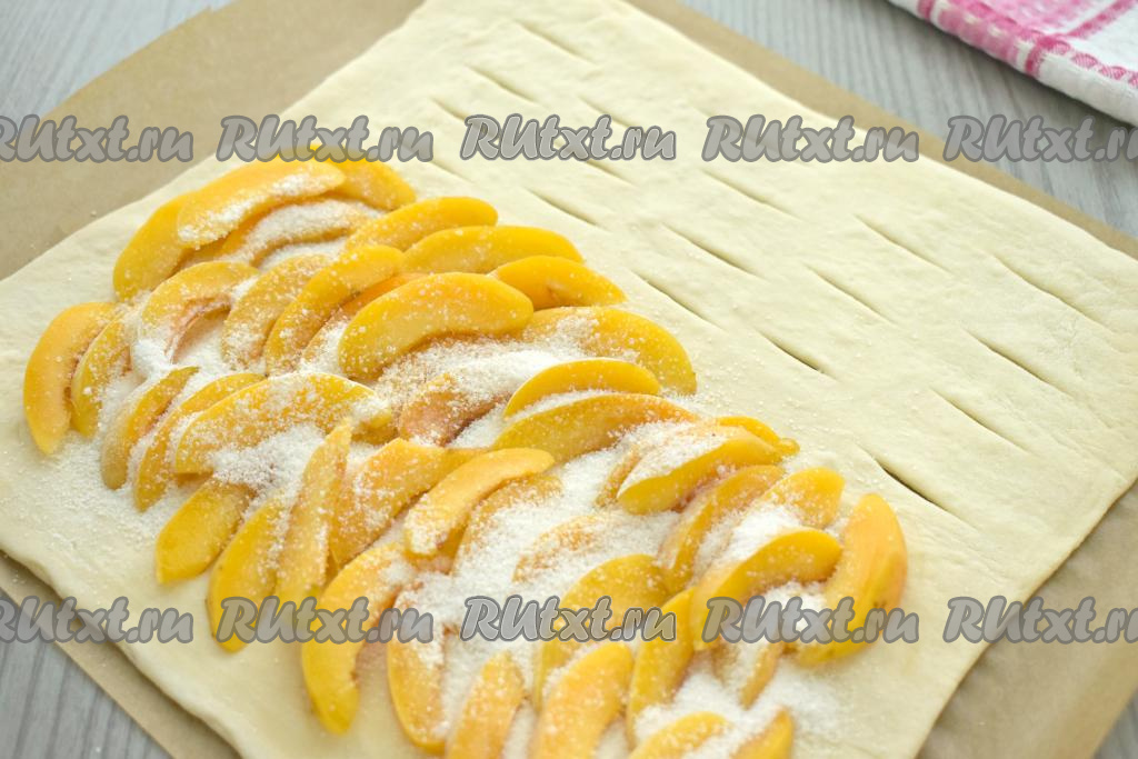 На сторону без надрезов, тоже отступая от краёв 1,5-2 сантиметра, выкладываем нарезанные абрикосы, присыпаем их сверху смесью сахара и крахмала.