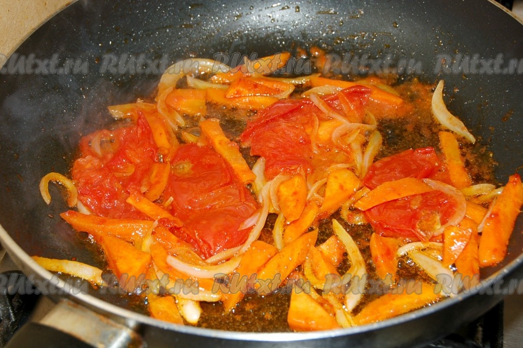 Нарезать морковь, помидоры и лук небольшими кусочками, обжарить на растительном масле.