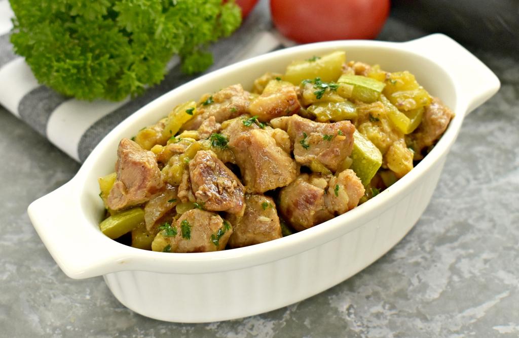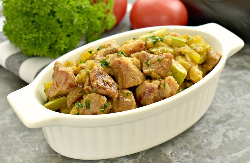 Мягкие кусочки свинины вместе с сочными, нежными кабачками и баклажанами раскладываем со сковороды по тарелкам и в горячем виде сытное, вкусное блюдо подаём к столу.