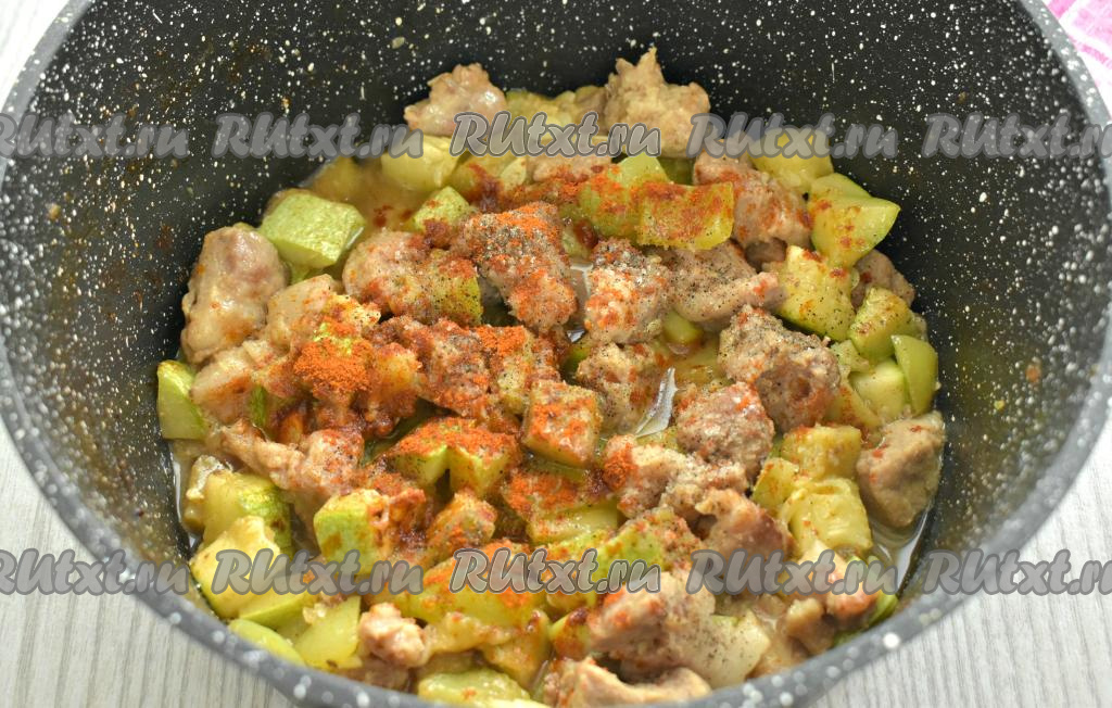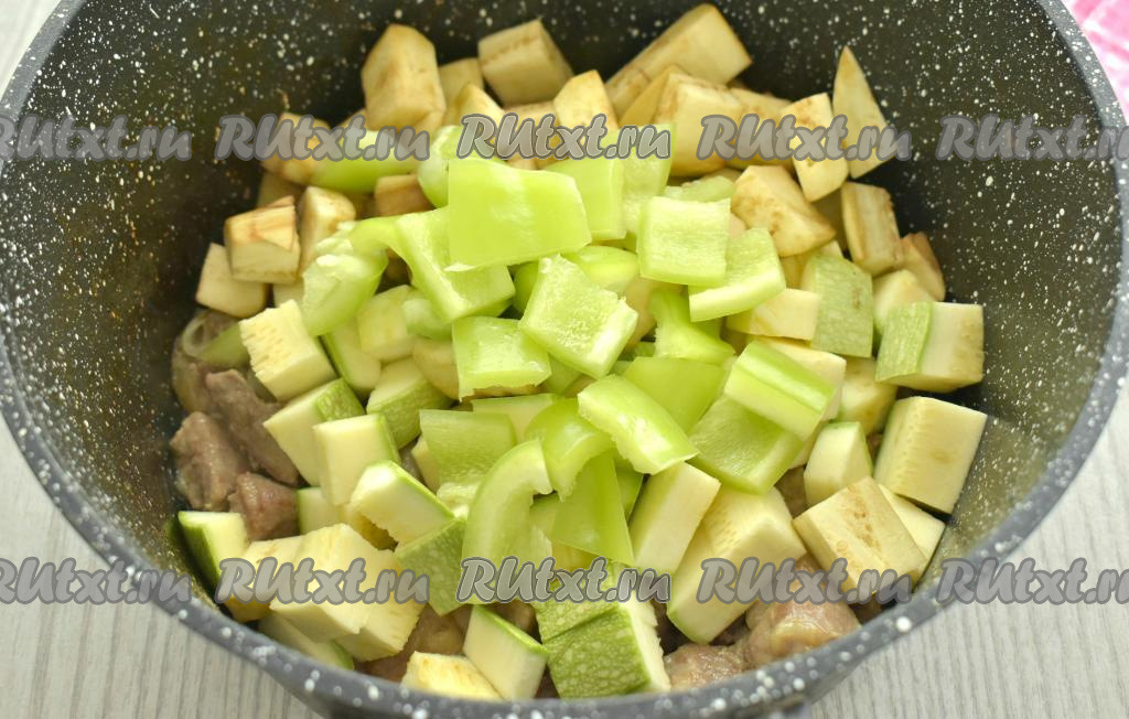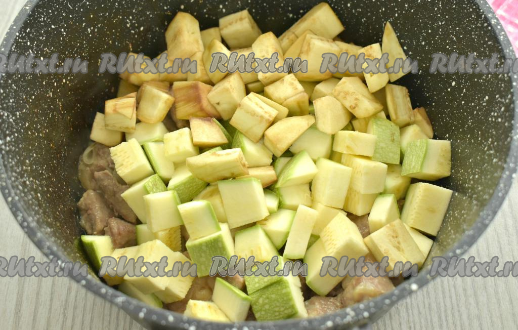 Баклажан очищаем от кожуры, нарезаем на небольшие кубики. Кабачок я взяла молодой, то есть с тонкой кожурой и мелкими семечками, поэтому просто вымыла его и обрезала кончики с двух сторон (очищать от кожуры и семечек я его не стала). Если же вы будете использовать кабачок с толстой кожурой, тогда кожуру нужно будет срезать, крупные семечки нужно будет удалить. 400 грамм подготовленного кабачка нарезаем на небольшие кубики. Нарезанные баклажаны и кабачки выкладываем к свинине, протушившейся в течение 15 минут.